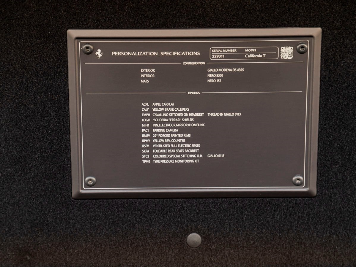 Draped in vibrant Giallo Modena, this California T commands attention with its sculpted body lines and timeless Ferrari silhouette. The retractable hardtop seamlessly transforms the car from an elegant coupe to an exhilarating convertible in seconds, offering versatility without compromise. 20 Forged and Painted Wheels complement the cars athletic stance, while striking Yellow Brake Calipers provide a bold visual accent behind the wheels. The Scuderia Ferrari Shields proudly displayed on the front fenders further emphasize its racing pedigree and unmistakable identity.
