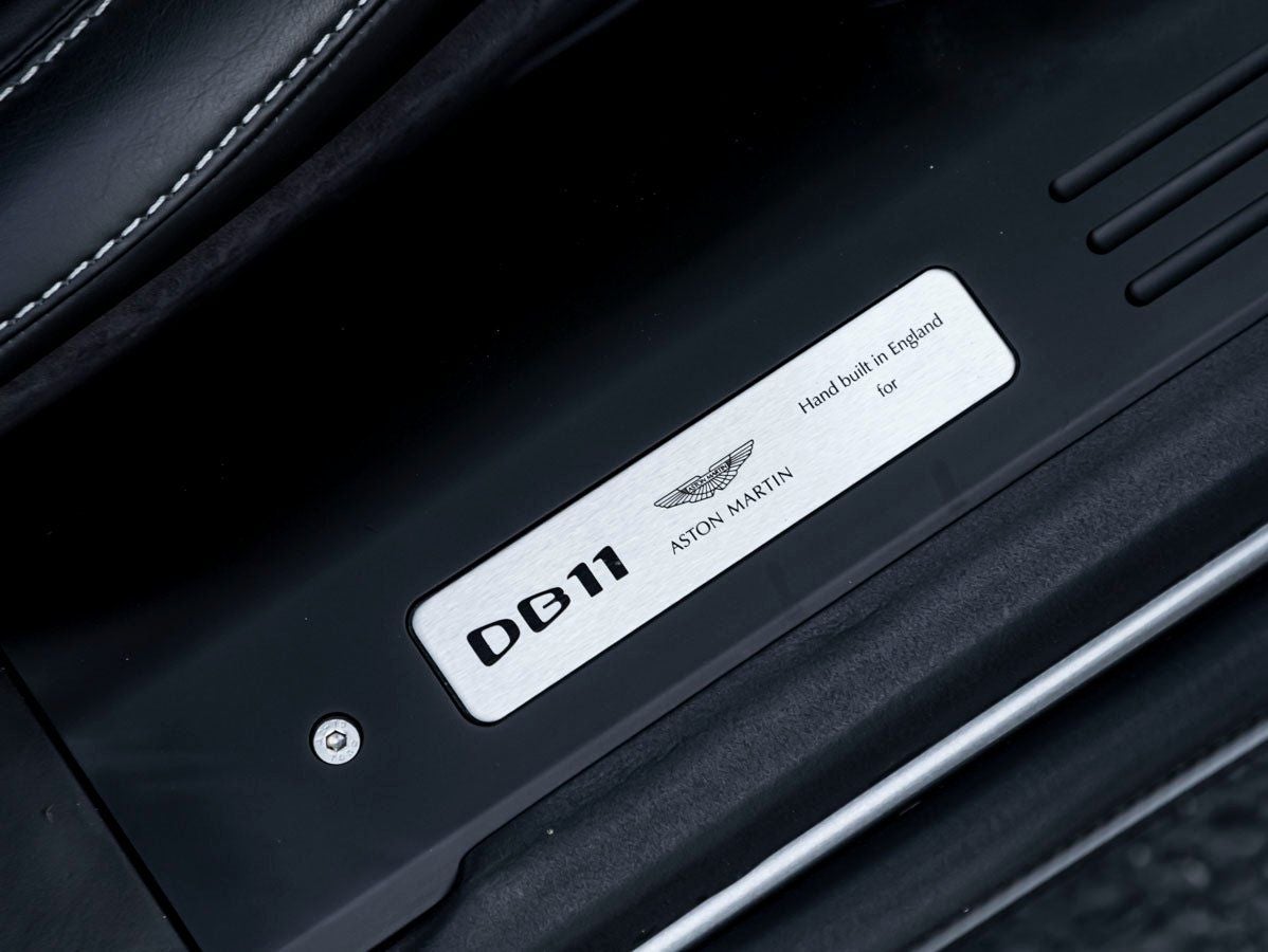 The DB11s sculpted aluminum bodywork is both graceful and purposeful, reflecting Aston Martins iconic design language. Finished in striking Tungsten Silver, its flowing lines are enhanced by the Carbon Fiber Splitter and Diffuser, adding a motorsport-inspired edge. The Carbon Fiber Finisher Pack and Trim Inlay Satin Chopped Carbon further emphasize its performance-focused aesthetic, while the Dark Chrome Jewelry Pack and Black Side Window Finisher provide a modern, sophisticated contrast. Subtle yet distinctive details such as Smoked Rear Lamps and bold Black Brake Calipers complete the commanding presence of this grand touring coupe.