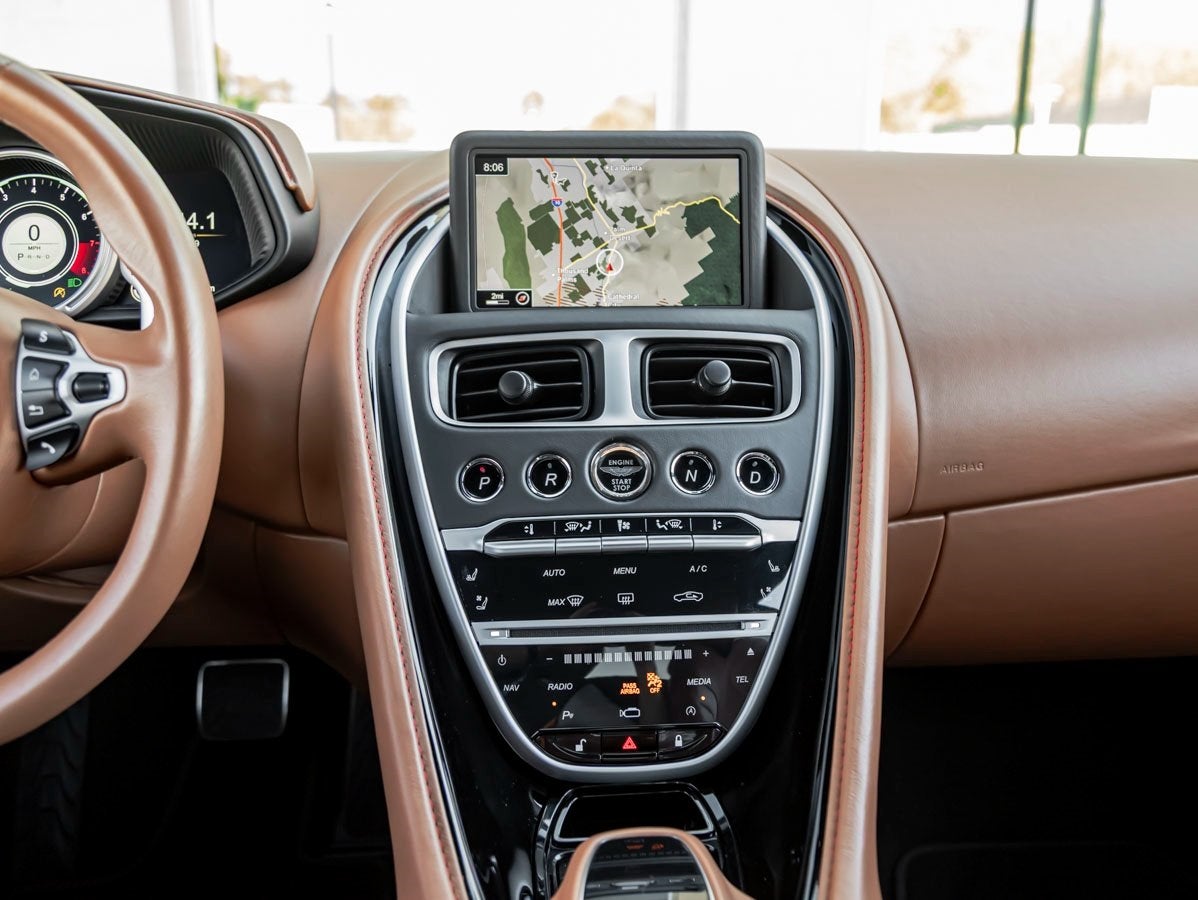 Inside, the DB11 welcomes you into a meticulously crafted cabin where luxury meets performance. The Copper Tan Leather interior is enhanced by AML Special leather selection, Contrast Stitching and Welt, and refined details such as Headrest Embroidery with Aston Martin Wings. Premium materials including Alcantara accents, a Color Keyed Steering Wheel, and Piano Black Trim Inlays create an atmosphere that is both sophisticated and driver-focused. Comfort is elevated with Ventilated Front Seats and Power Seat Bolsters, ensuring every drive is as relaxing as it is engaging.