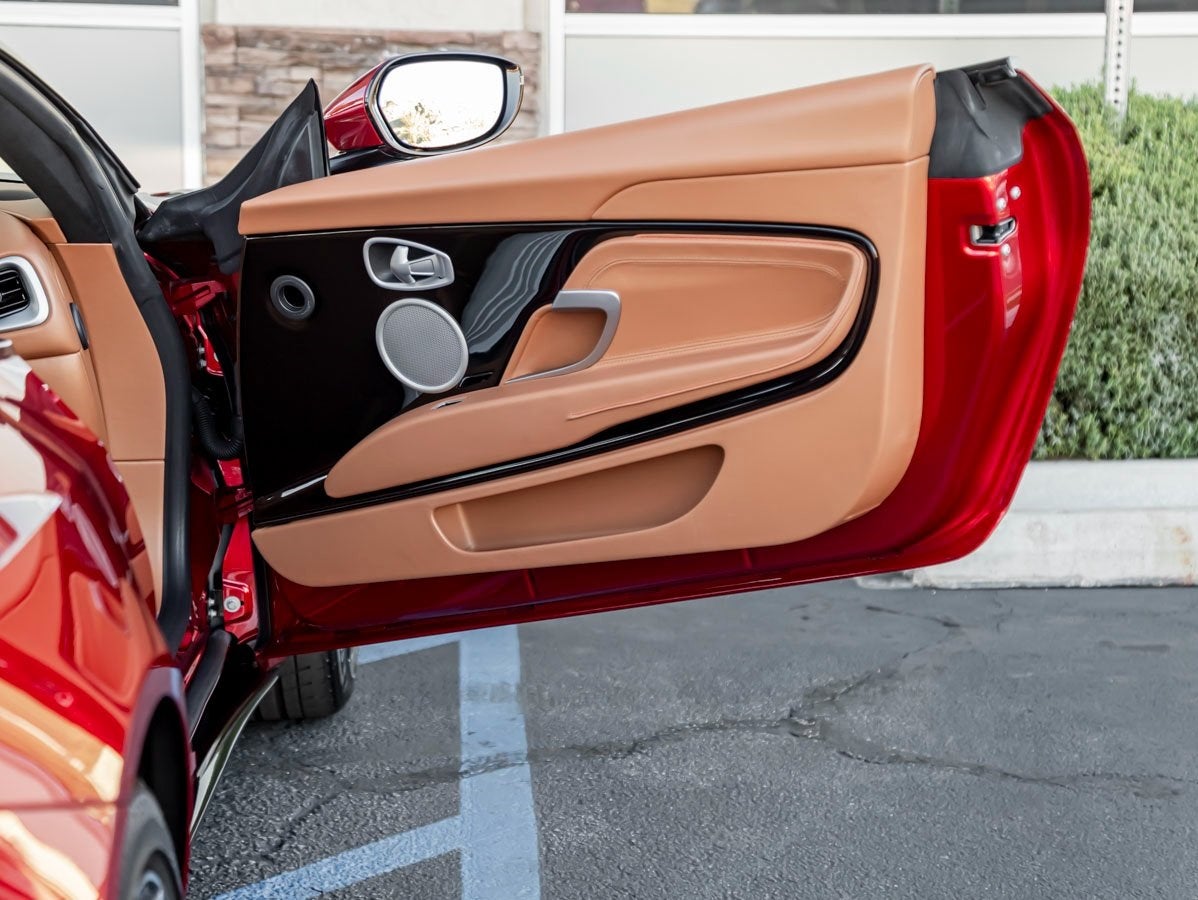 The DB11 Coupe is a stunning vision of modern elegance, defined by its flowing lines, athletic stance, and unmistakable Aston Martin presence. The dramatic Volcano Red finish highlights every sculpted contour, while the Exterior Black Pack, Smoked Rear Lamps, and 10-Spoke Directional Gloss Black Wheels add a contemporary, performance-inspired edge to its iconic silhouette.